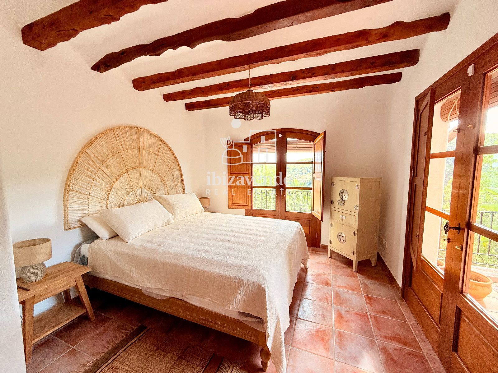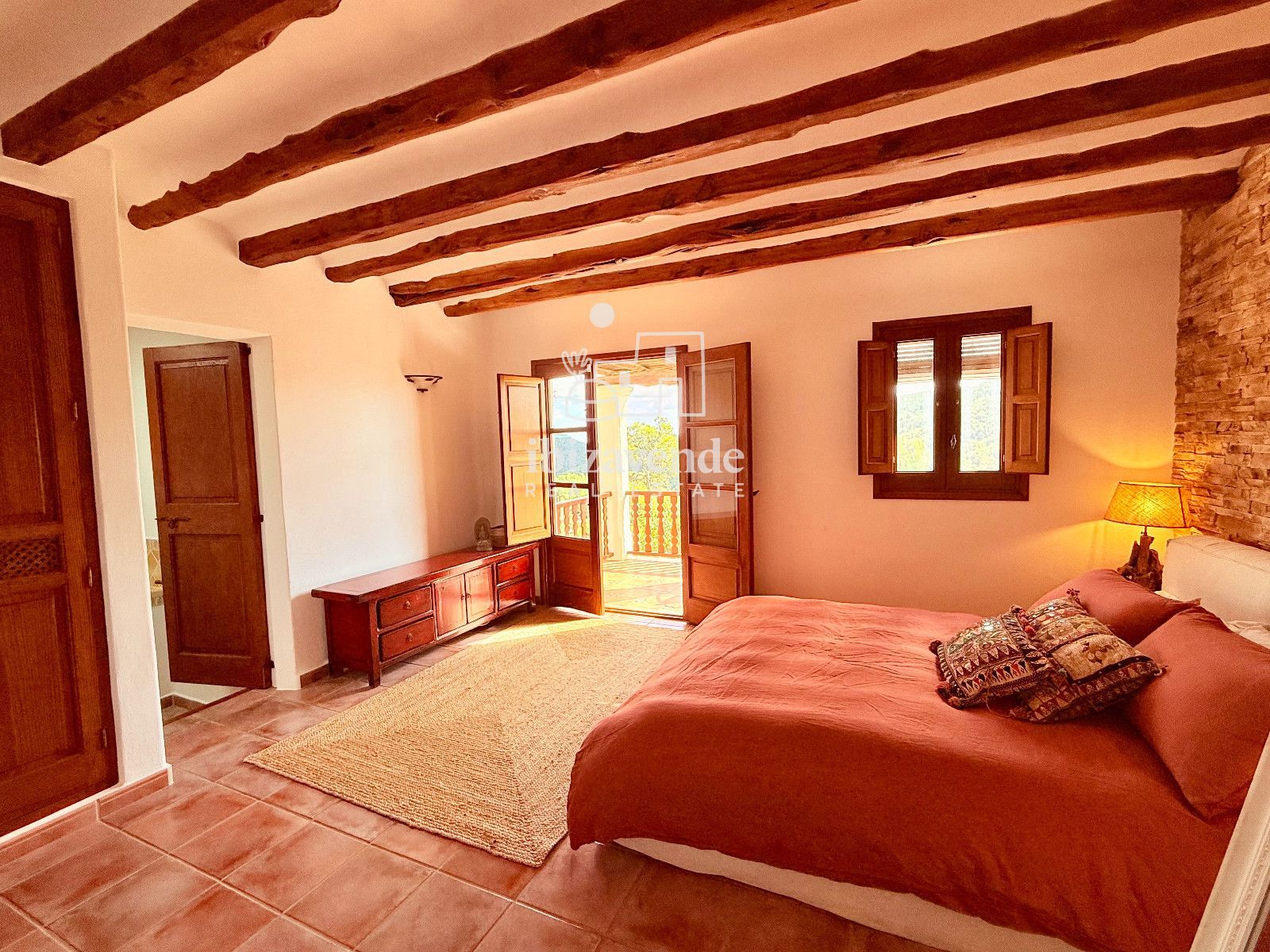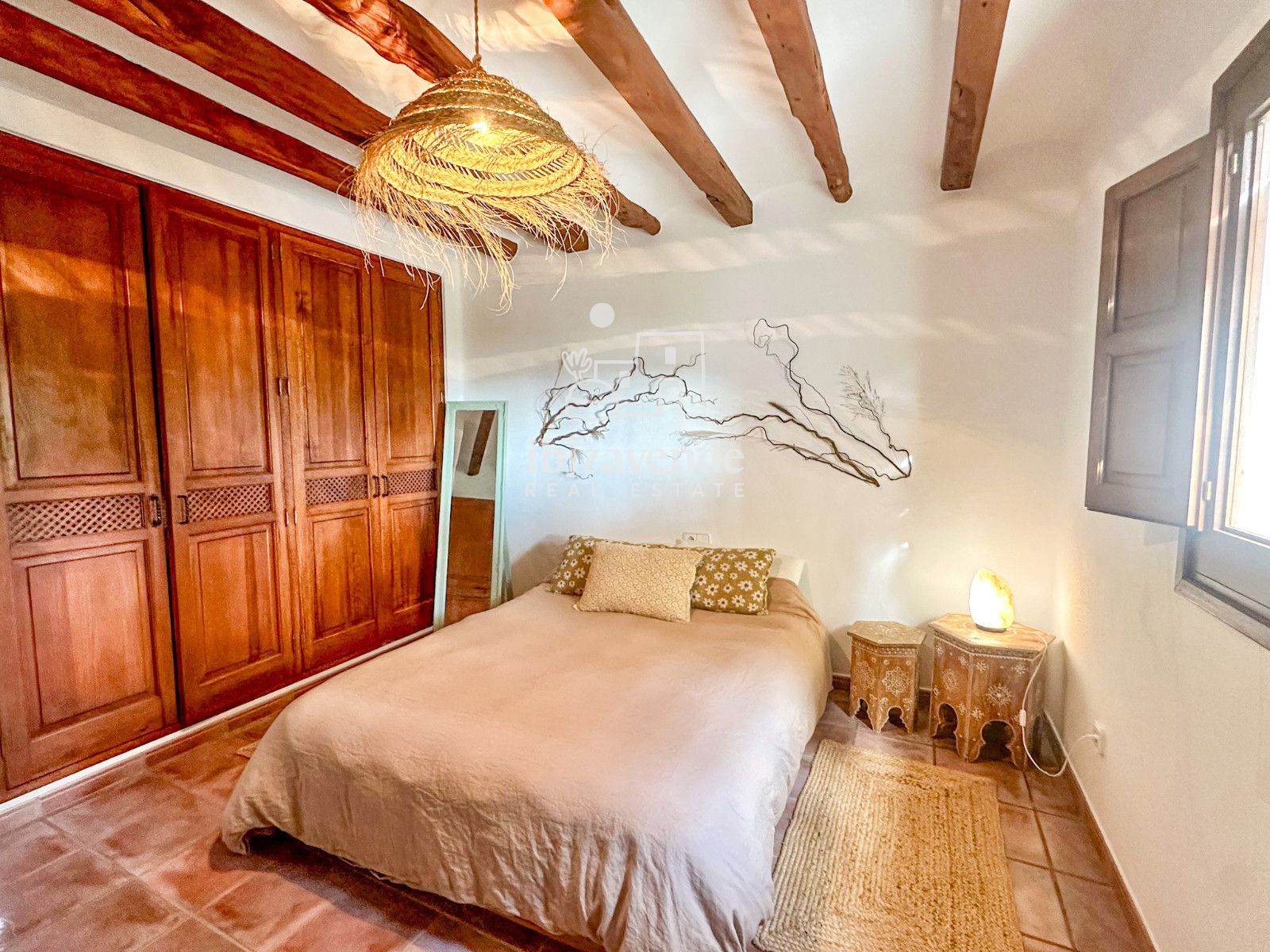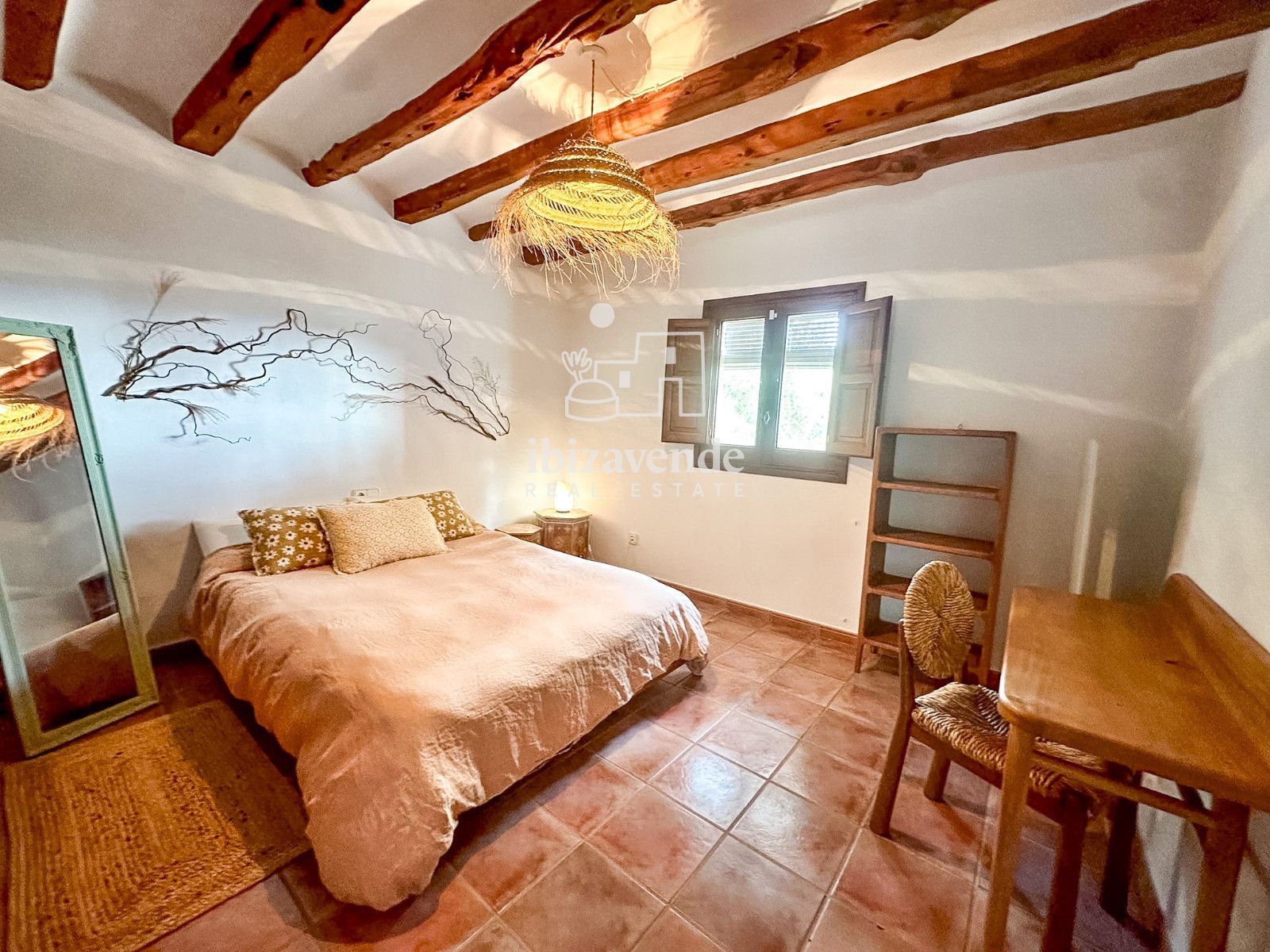 La maison dispose de 3 chambres doubles et d’un canapé-lit dans le salon, spacieuses et lumineuses, toutes avec des vues dégagées sur la nature. Les intérieurs se distinguent par leurs hauts plafonds avec poutres en bois, des finitions naturelles et une combinaison soignée de pierre et de bois qui apportent caractère et essence ibizienne traditionnelle.