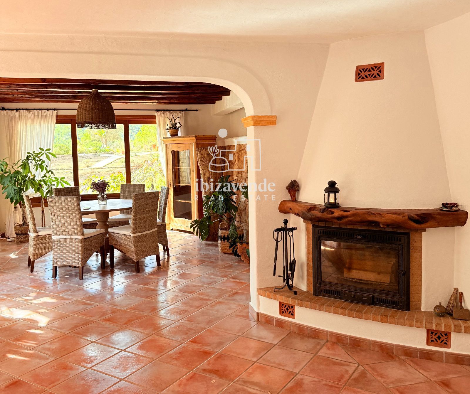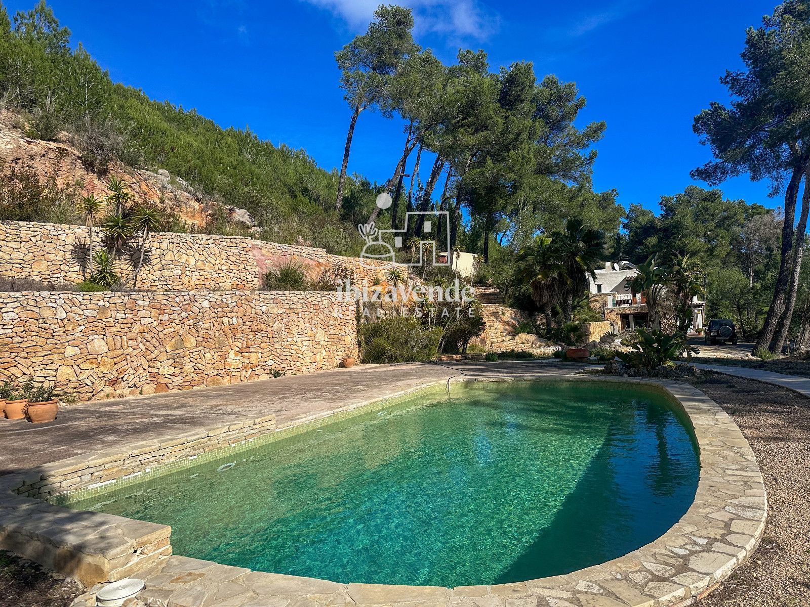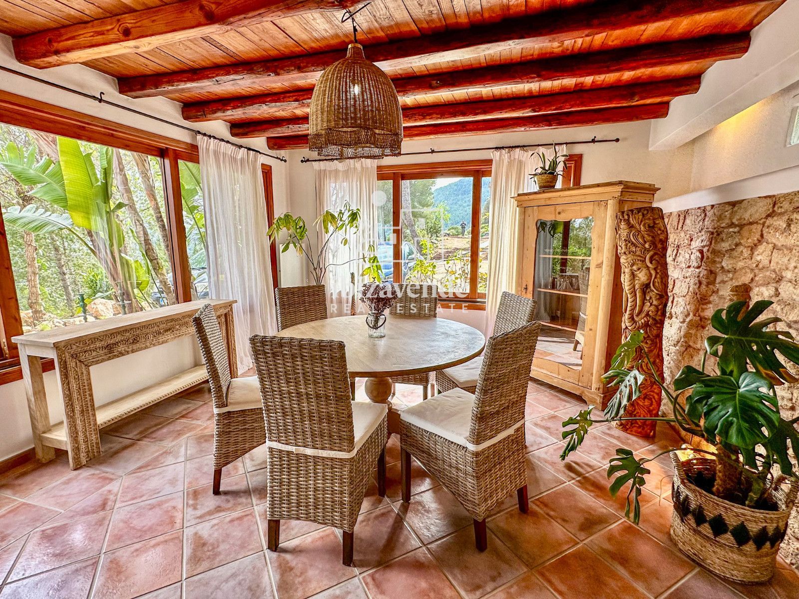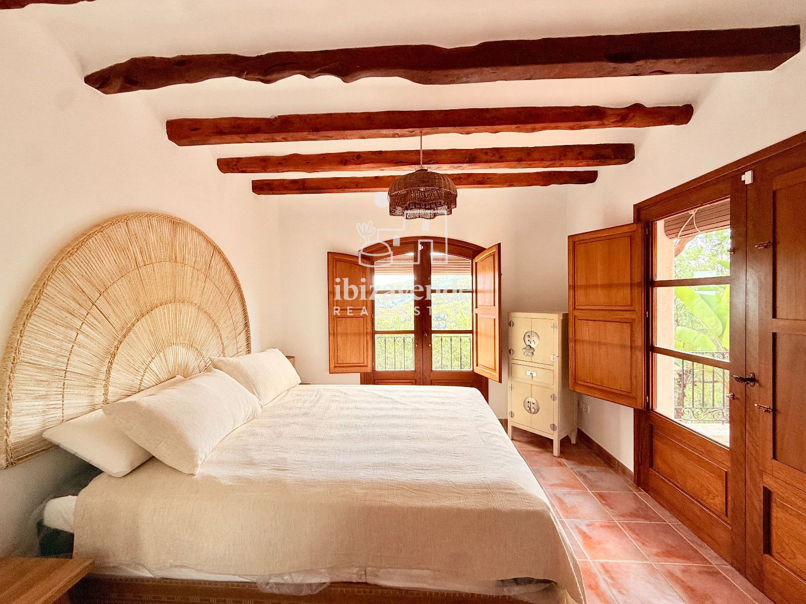 La maison dispose de 3 chambres doubles et d’un canapé-lit dans le salon, spacieuses et lumineuses, toutes avec des vues dégagées sur la nature. Les intérieurs se distinguent par leurs hauts plafonds avec poutres en bois, des finitions naturelles et une combinaison soignée de pierre et de bois qui apportent caractère et essence ibizienne traditionnelle.