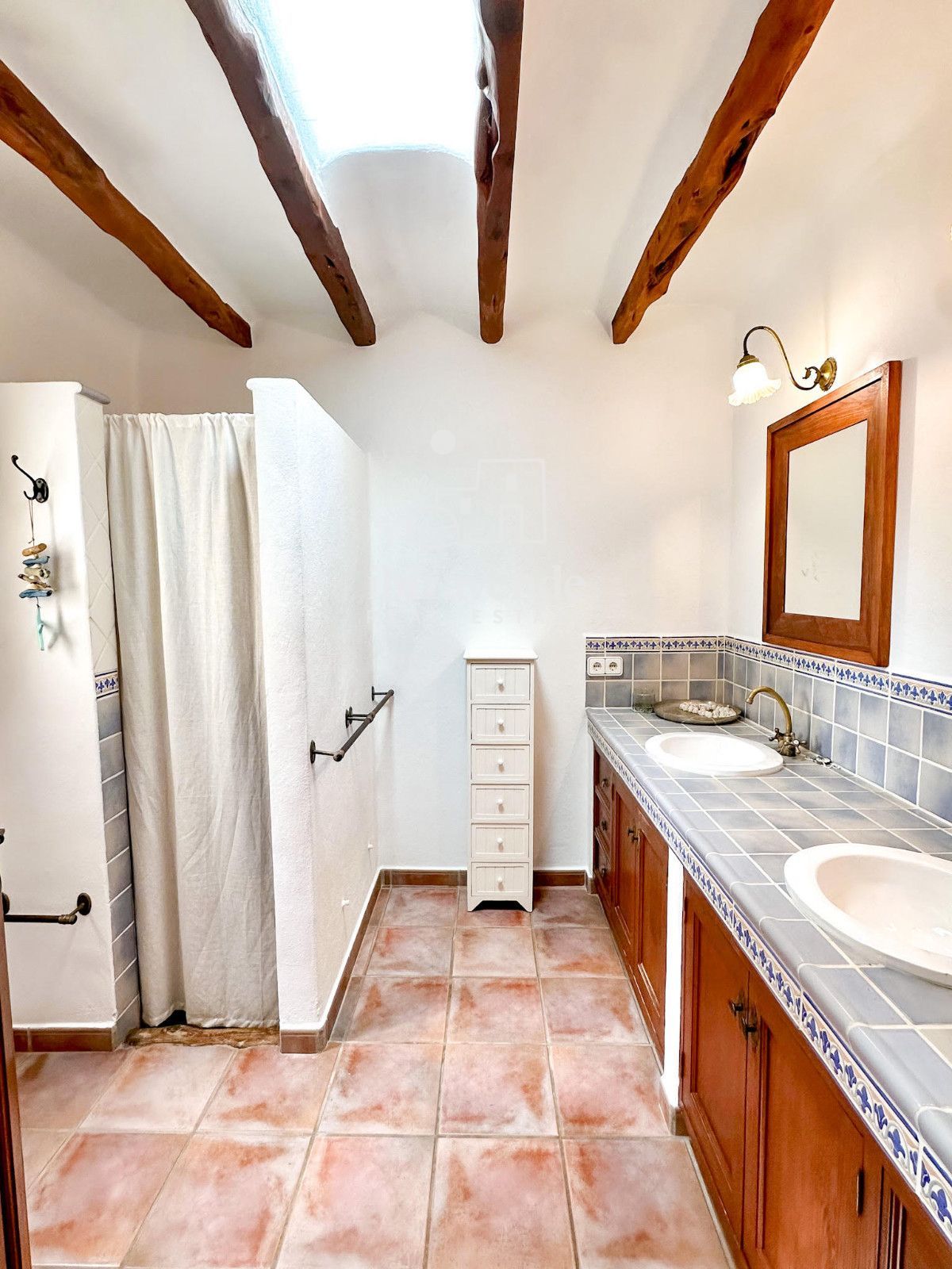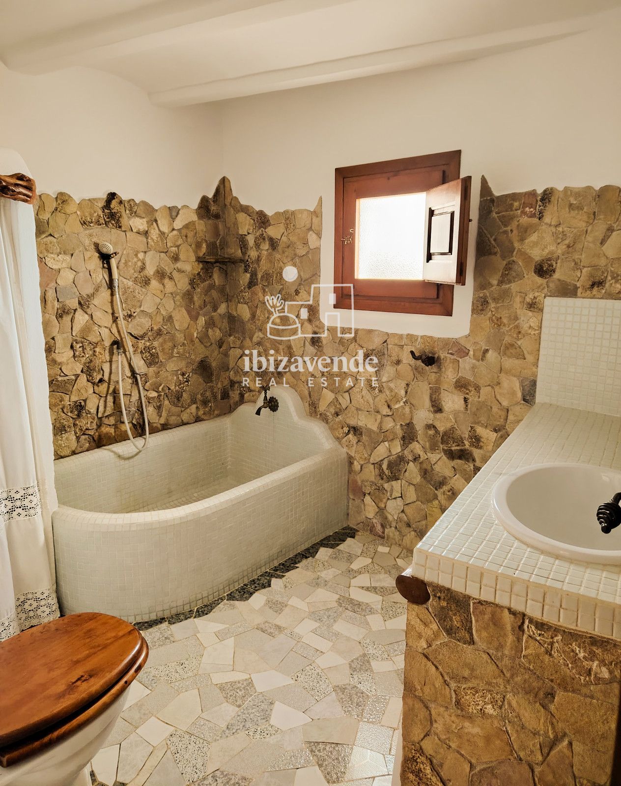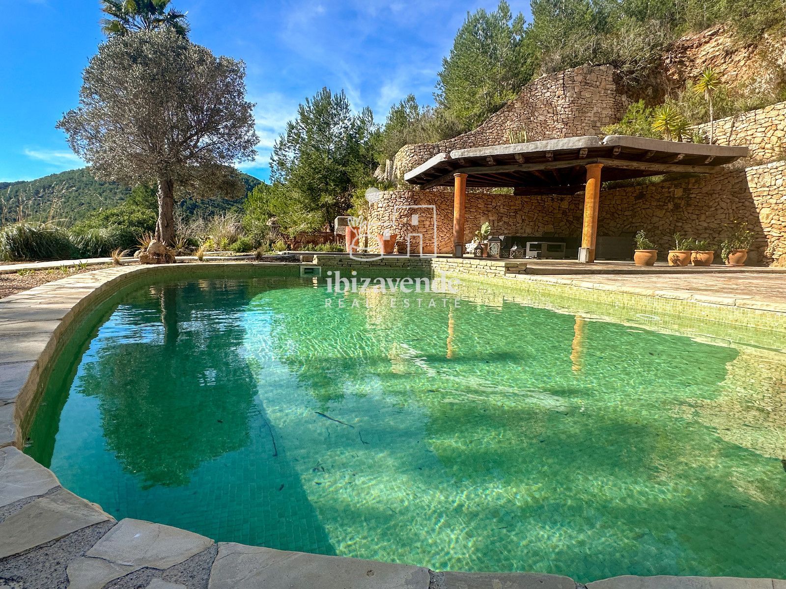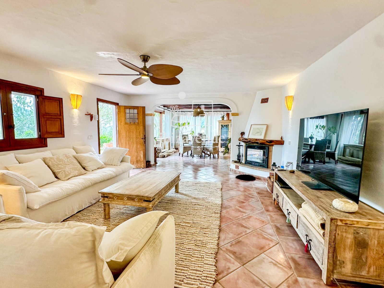 La maison dispose de 3 chambres doubles et d’un canapé-lit dans le salon, spacieuses et lumineuses, toutes avec des vues dégagées sur la nature. Les intérieurs se distinguent par leurs hauts plafonds avec poutres en bois, des finitions naturelles et une combinaison soignée de pierre et de bois qui apportent caractère et essence ibizienne traditionnelle.