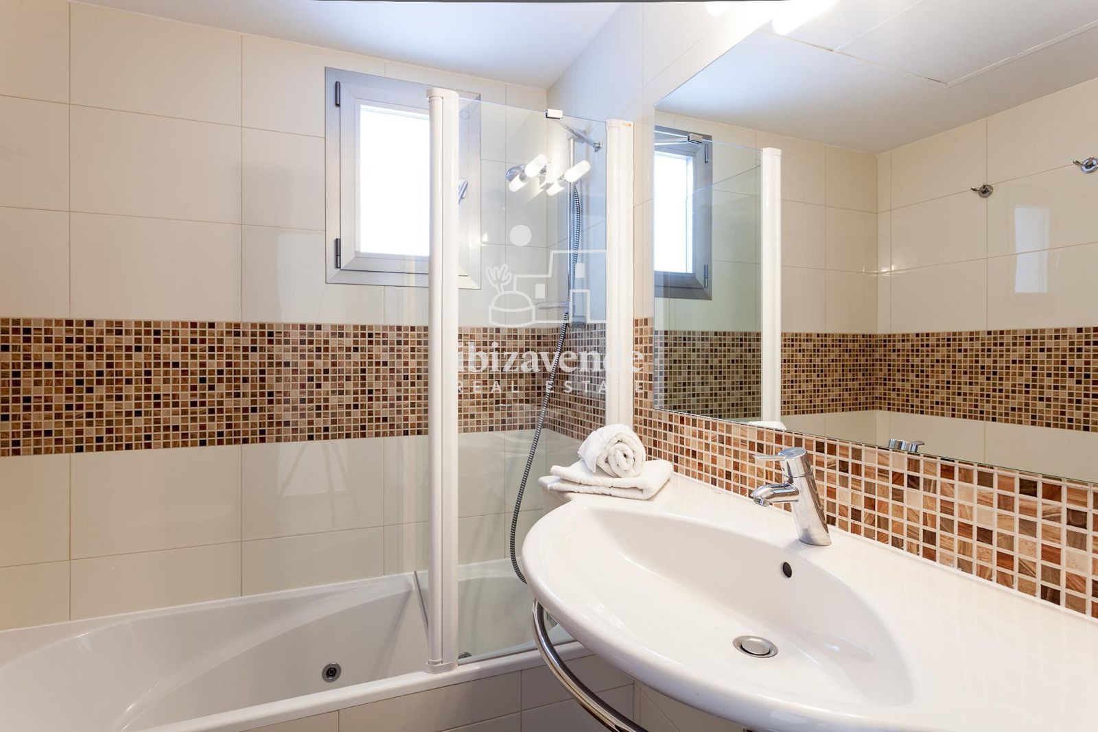 Location à l'année ! Magnifique appartement au rez-de-chaussée avec vue imprenable sur la mer à Cala Gracio. Il comprend deux chambres, deux salles de bains , une cuisine moderne avec tous les appareils électroménagers, un salon-salle à manger avec accès direct à la terrasse offrant une vue imprenable sur la mer et les plus beaux couchers de soleil. L'appartement est entièrement équipé et prêt à emménager. Quartier résidentiel calme et familial à quelques minutes de San Antonio. Il dispose de la climatisation chaud-froid et d'une place de parking. Attention, les meubles sur les photos ne sont pas les mêmes !